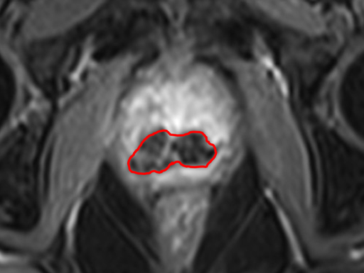 Image 2 shows the effect of the treatment of patient 10. Treatment for patient 10 was focal, meaning that the purpose was only to treat the part where the tumour was present and not the entire prostate gland. In the image this is shown as the dark area in the lower part of the prostate. The light part of the prostate, in the upper part of the image, indicates untreated tissue.