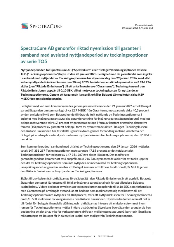 Nyttjandeperioden för SpectraCure AB (”SpectraCure” eller "Bolaget") teckningsoptioner av serie TO5 ("Teckningsoptionerna") löpte ut den 28 januari 2025. I enlighet med de garantiavtal som ingicks i samband med nyttjandet av Teckningsoptionerna har styrelsen idag den 29 januari 2026, med stöd av bemyndigande från årsstämman den 30 maj 2025, beslutat om en riktad nyemission av 8 916 736 aktier (den "Riktade Emissionen") till ett antal investerare ("Garanterna"). Teckningskursen i den Riktade Emissionen uppgår till 0,10 SEK, vilket motsvarar teckningskursen för nyttjande av Teckningsoptionerna. Genom att ta garantin i anspråk erhåller Bolaget därmed totalt cirka 0,89 MSEK före emissionskostnader.