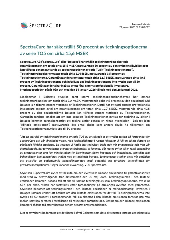 SpectraCure AB (”SpectraCure” eller "Bolaget") har erhållit teckningsförbindelser och garantiåtaganden om totalt cirka 15,6 MSEK motsvarande 50 procent av den emissionslikvid Bolaget kan tillföras genom nyttjande av teckningsoptioner av serie TO5 ("Teckningsoptionerna"). Teckningsförbindelser omfattar totalt cirka 3,0 MSEK, motsvarande 9,5 procent av Teckningsoptionerna. Garantiåtagandena omfattar totalt cirka 12,7 MSEK, motsvarande cirka 40,5 procent av Teckningsoptionerna och införlivas om Teckningsoptionerna inte nyttjas upp till 50 procent. Garantiåtagandena har ingåtts av ett fåtal externa professionella investerare. Nyttjandeperioden pågår från och med den 14 januari 2026 till och med den 28 januari 2026.