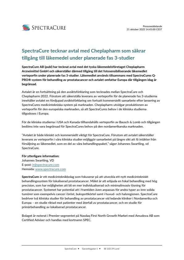 SpectraCure AB (publ) har tecknat avtal med det tyska läkemedelsföretaget Cheplapharm Arzneimittel GmbH och säkerställer därmed tillgång till det fotosensibiliserande läkemedlet verteporfin under planerade fas 3-studier. Läkemedlet används tillsammans med SpectraCures Q-PRO®-system för behandling av prostatacancer och avtalet omfattar Europa där tillgången idag är begränsad.